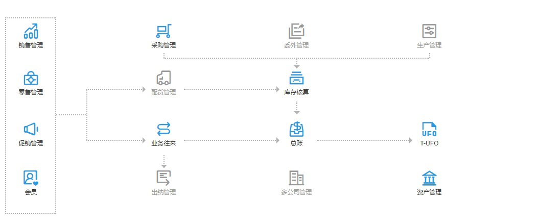 项目涉及到仓库、采购、销售、财务、生产等多个部门多个方面,使用畅捷通T+13.0标准版软件,使用模块有购销管理、库存管理、往来现金、总账、报表、固定资产、生产管理、会员、零售收银、促销、T+工作圈模块。