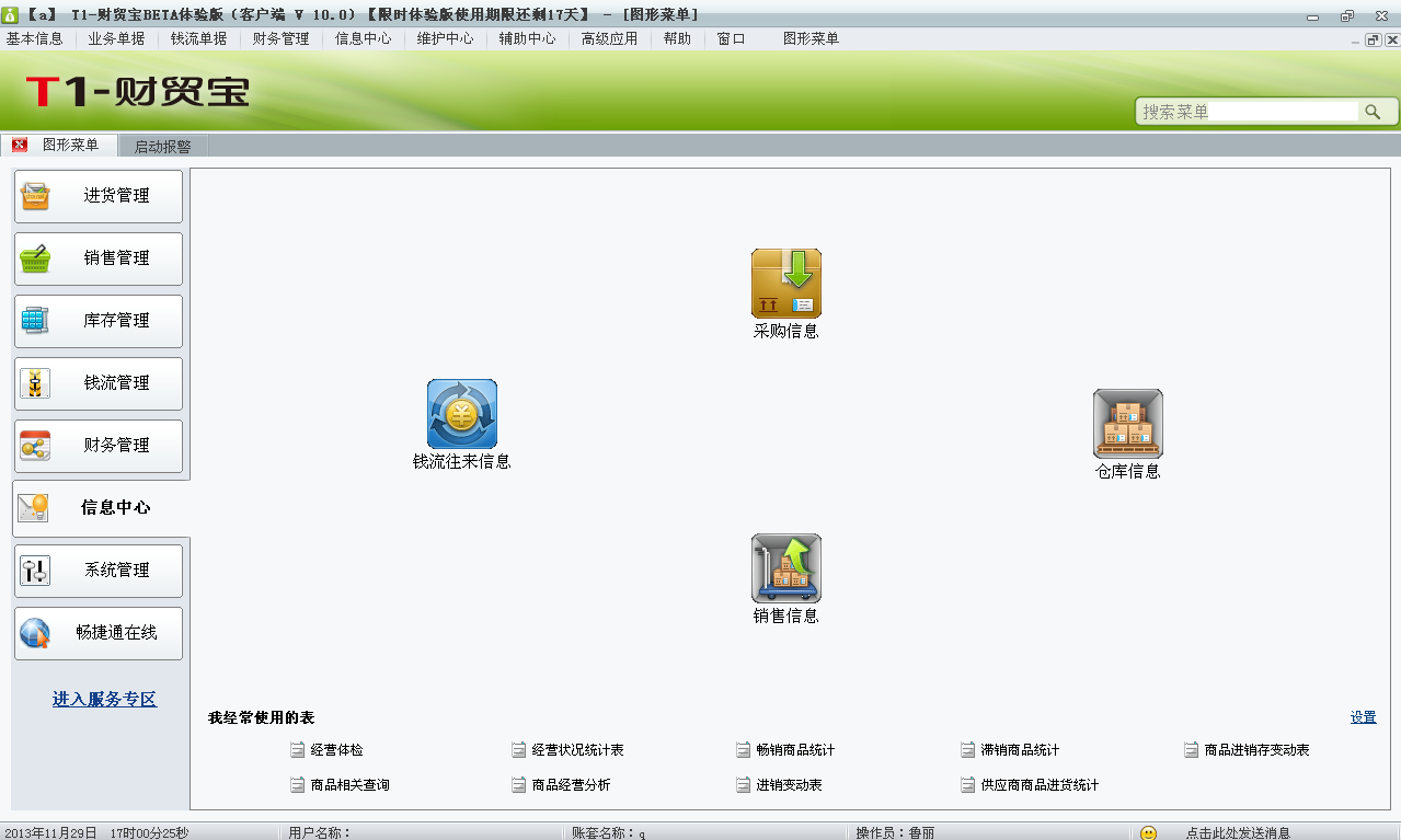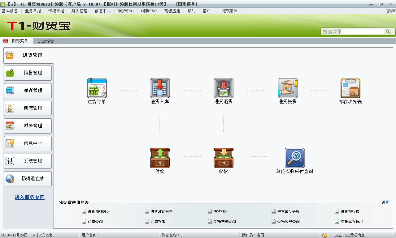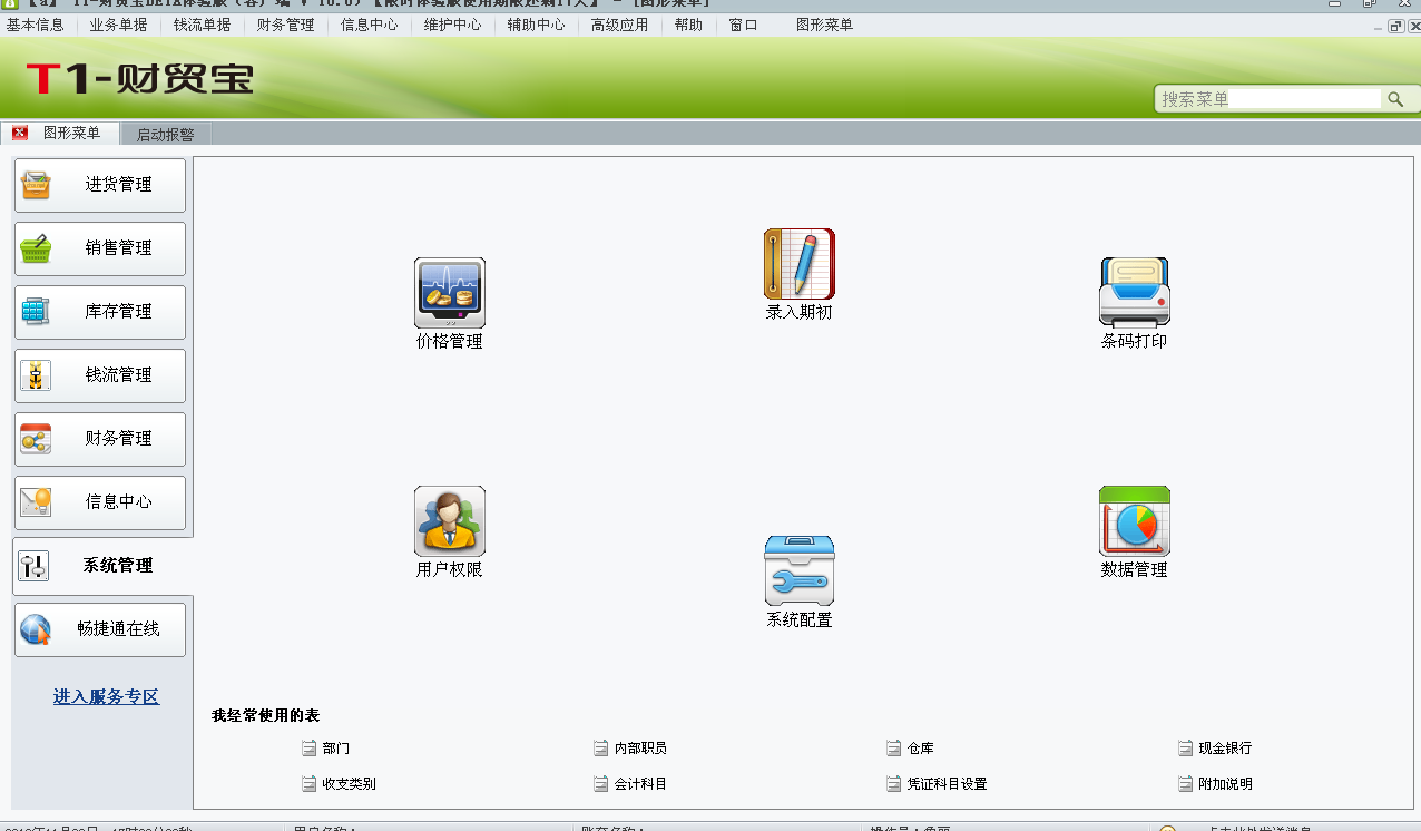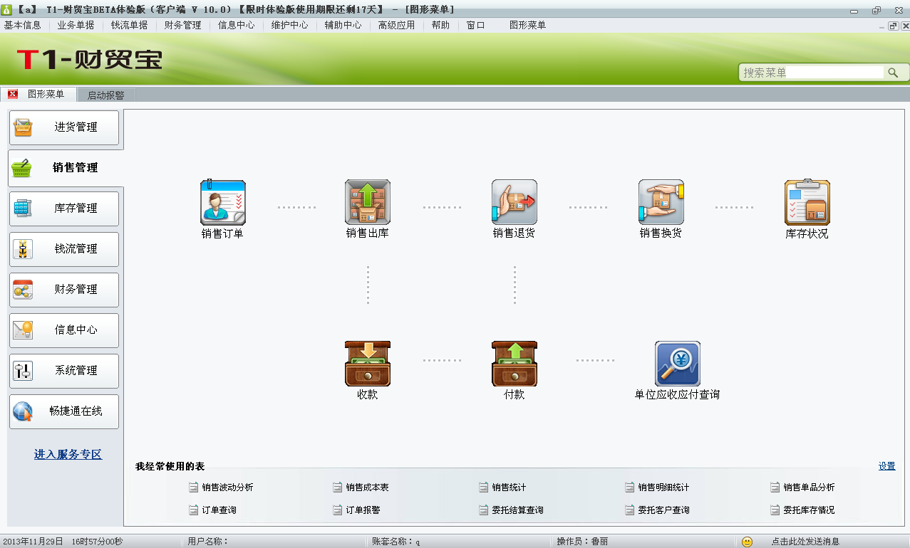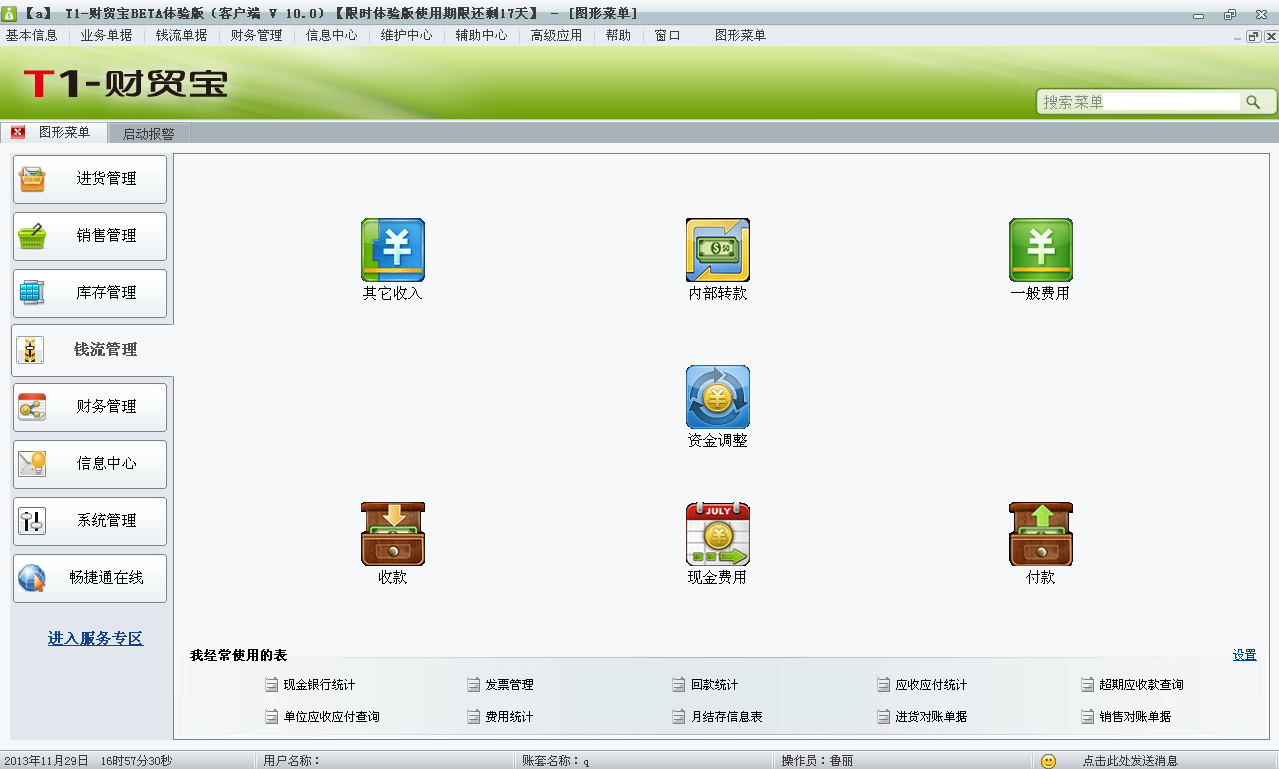 6) 钱流业务:收款业务、付款业务、其它收入、费用管理、内部转款、调账业务。