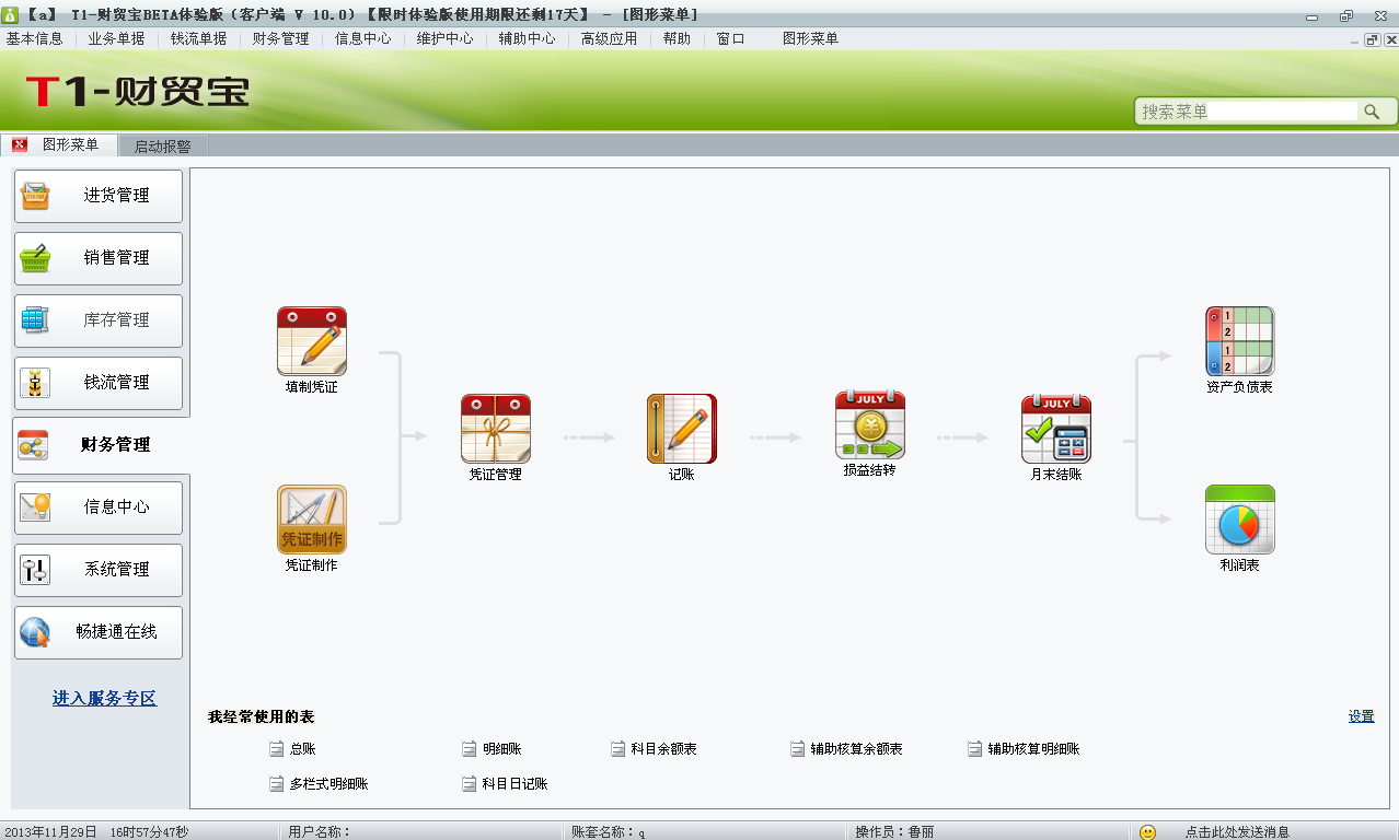 7) 总账管理:凭证填写、凭证审核、凭证记账、凭证标错、任证红冲、凭证复制、凭证整理、凭证断号查询、常用凭证、凭证管理、现金流量分配、凭证制作、结转损益、期末结账。